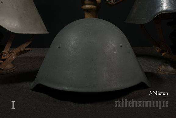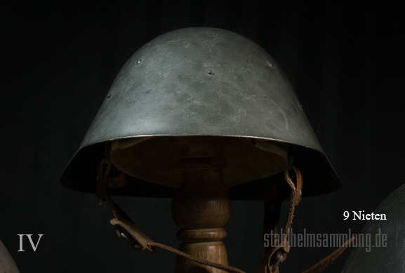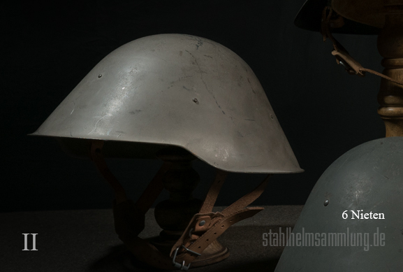 Diese Innenausstattung wurde schließlich an 6 angelöteten Knöpfchen befestigt. Man unternahm auch Versuche, die Knöpfchen durch die Helmschale festzunieten.